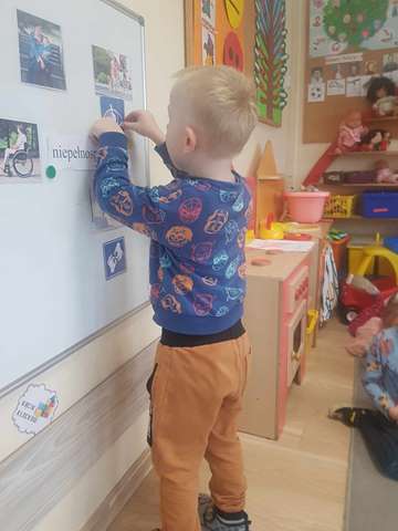 1 grudnia w naszym przedszkolu obchodziliśmy Międzynarodowy Dzień Osób Niepełnosprawnych. Nauczyciele w grupach przeprowadzili zajęcia przybliżające dzieciom temat niepełnosprawności. Dzieci w formie zabawy doświadczały jak trudno żyć na co dzień, gdy nie słyszymy, nie widzimy lub kiedy mamy trudności w poruszaniu się. Dowiedziały się z jakimi trudnościami na c borykają się osoby niepełnosprawne i jak ważna jest ich akceptacja i tolerancja. Po tych zajęciach będą już wiedzieć, jak można pomóc osobie niepełnosprawnej w przeróżnych sytuacjach. Przedszkolaki dzieliły się również swoimi doświadczeniami  w kontaktach z osobami niepełnosprawnymi.