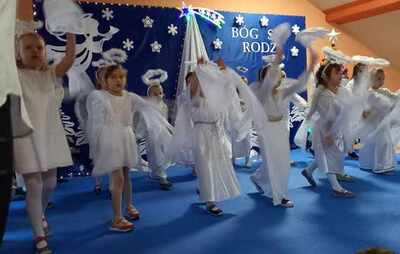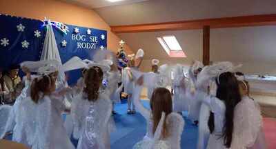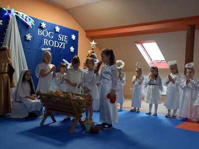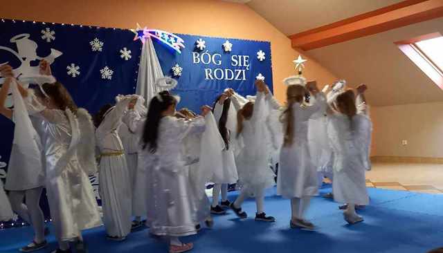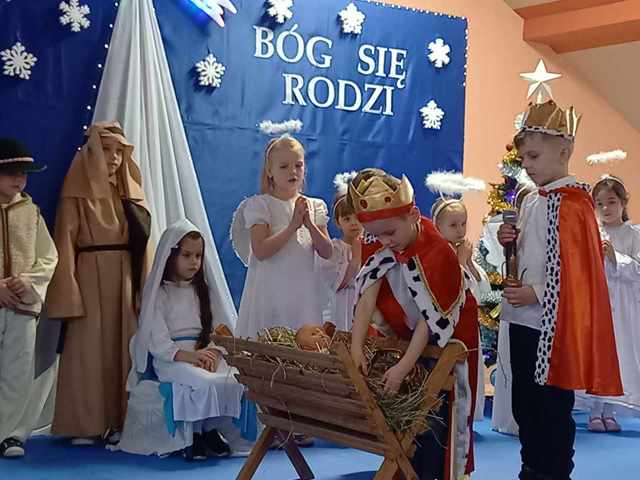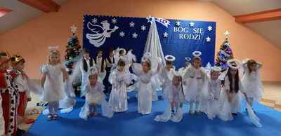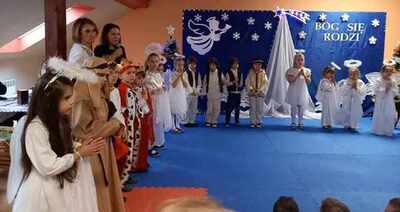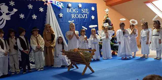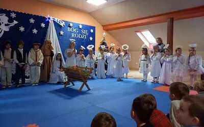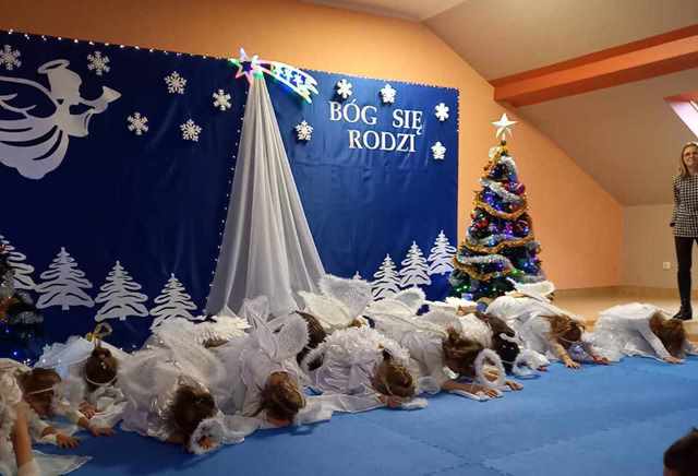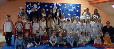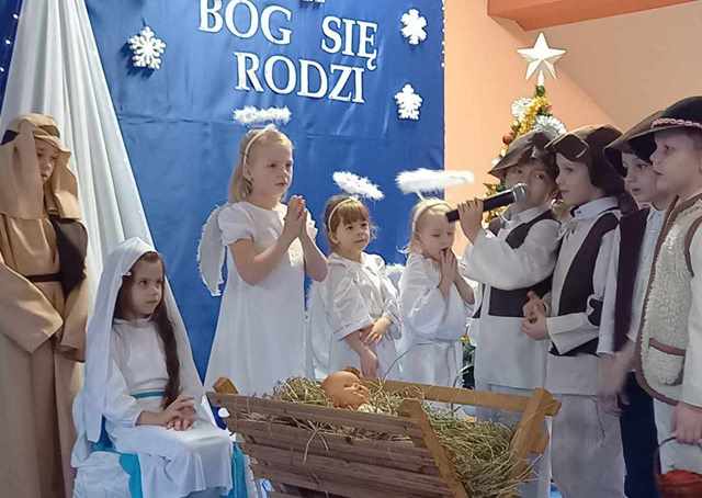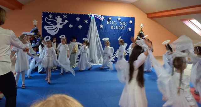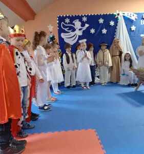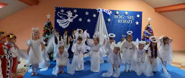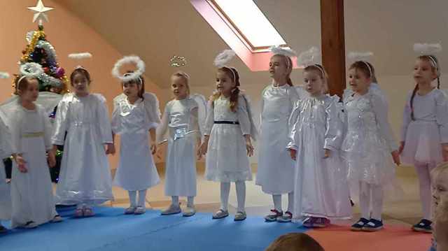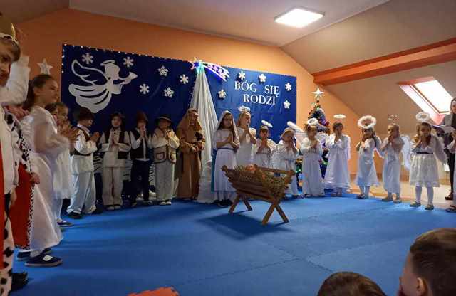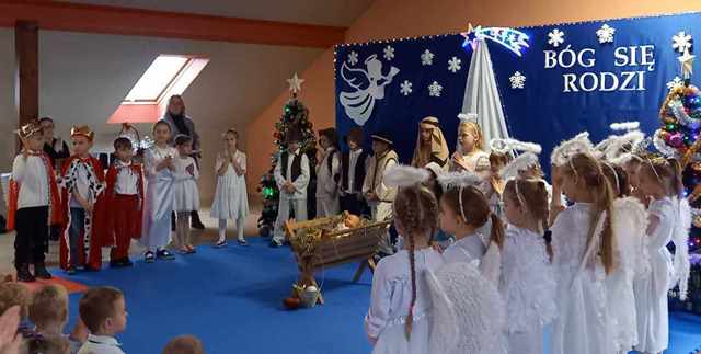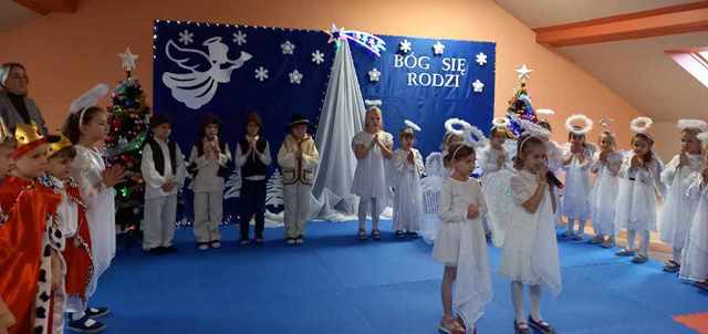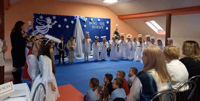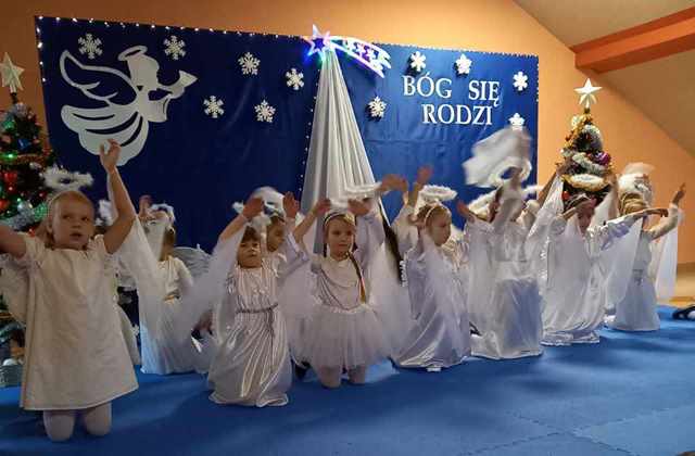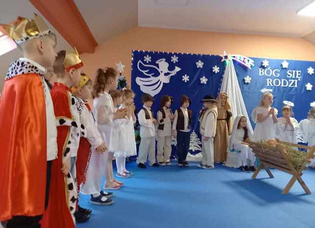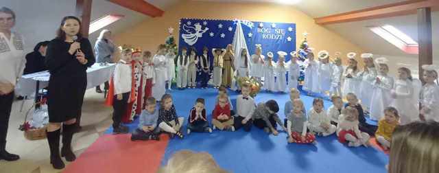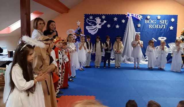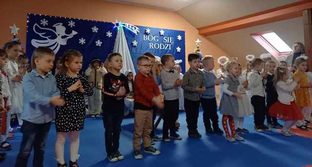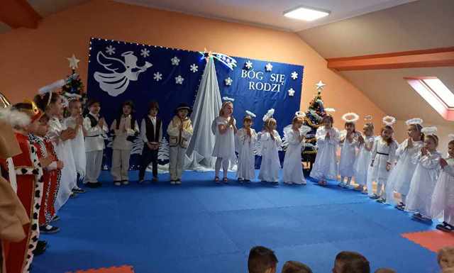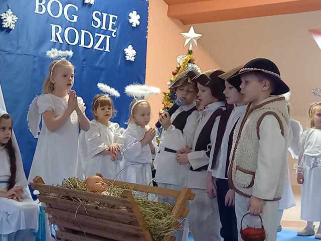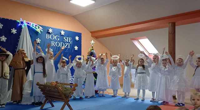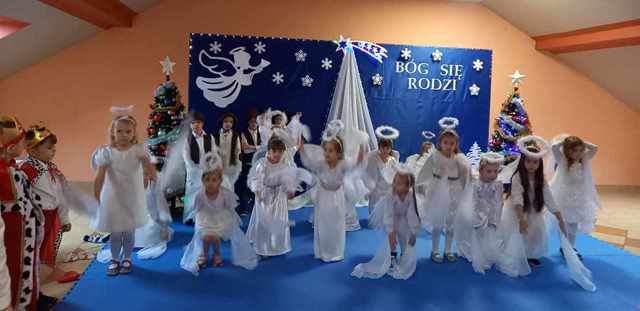Jak każe nasza tradycja przed Świętami Bożego Narodzenia grupa starszaków przygotowuje Jasełka Bożonarodzeniowe. W tym roku odbyły się 20 grudnia w Remizie OSP w Kozłowie. Pani dyrektor Ilona Słupczyńska powitała zaproszonych gości, rodziców i dzieci. I zaczęło się przedstawienie. Aniołki, Trzej Królowie, Pastuszkowie, Józef i Maryja pojawili się na scenie. Dzieci pięknie recytowały swoje kwestie, śpiewały kolędy, a dziewczynki zatańczyły „Taniec Aniołów”. Przedszkolaki z grupy Pszczółki zaśpiewały pastorałkę. Na koniec pani dyrektor złożyła wszystkim życzenia świąteczne i dzieci udały się na słodki poczęstunek przygotowany przez rodziców.