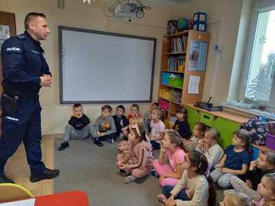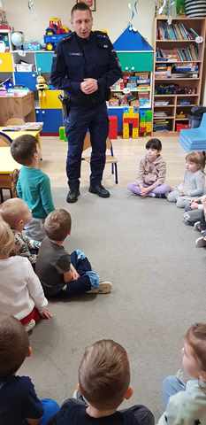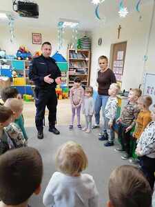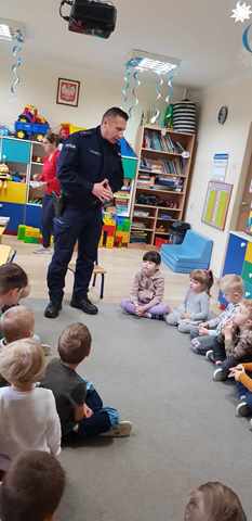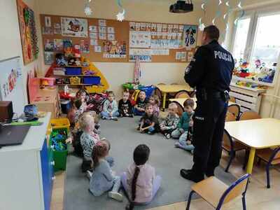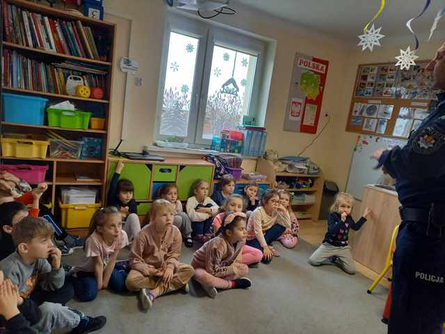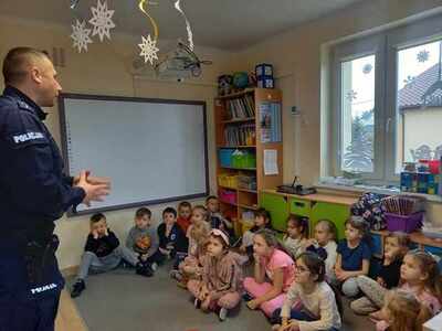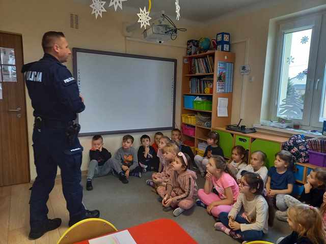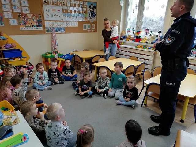 Już niedługo ferie zimowe. Dbając o bezpieczeństwo  przedszkolaków w przedszkolu, jak i w czasie wolnym w dniu 31.01.2024r. odbyło się spotkanie z Panem policjantem nt. „Bezpieczeństwo podczas ferii zimowych”.   Pan policjant omówił zasady bezpieczeństwa podczas zabaw zimowych na świeżym powietrzu. Przestrzegał przed ślizganiem się na zamarzniętych stawach i rzekach. Ostrzegł przed zjeżdżaniem z górek znajdujących się blisko ruchliwych ulic. Powiedział jak zachować się na kuligu. Poinformowali również dzieci o konieczności zamykania drzwi domu od wewnątrz i o zakazie wpuszczania osób nieznajomych.  Już wiemy do kogo zwracać się o pomoc w sytuacji zagrożenia.