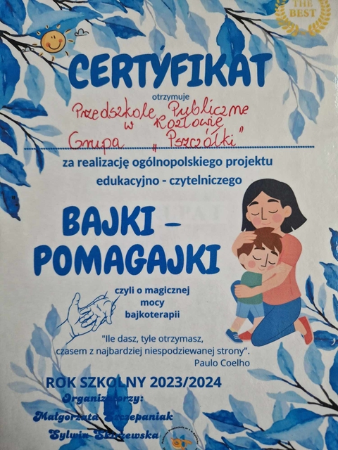 W dniu 30 maja 2024 r. zakończyliśmy realizację projektu „ Bajki Pomagajki” . W ramach projektu dzieci usłyszały 10 bajek - pomagajek. Poznały również nowych bohaterów bajeczek tj. : Kocię Złośnicę, Pieska Bąbelek, Króliczka Czarnouszka, Małą Myszkę, Króliczka Mikusia oraz żółwia Huberta. Dzięki usłyszanym bajkom terapeutycznym, dzieci mogły pokonać swoje obawy i lęki. Przede wszystkim zrozumiały: jak pokonać strach przed owadami i gryzoniami, jak pokonać lęk przed odrzuceniem z powodu pojawienia się nowego członka rodziny, jak pokonać lęk przed potworami i straszydłami, jak się należy zachować, gdy ktoś jest chory, jak rozwiązywać konflikty rówieśnicze, jak pokonać lęk przed przedszkolem oraz lęk przed ciemnością. Czytanie bajek sprzyjało ochronie i wzmocnieniu zdrowia psychicznego przedszkolaków.