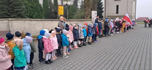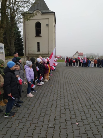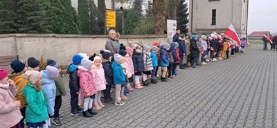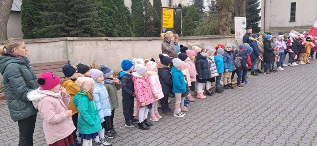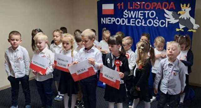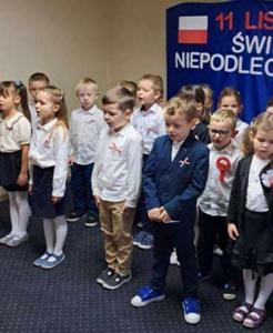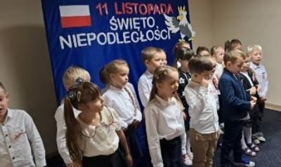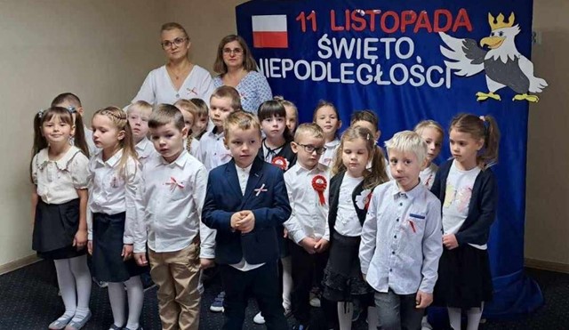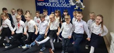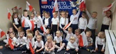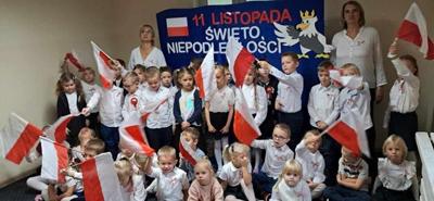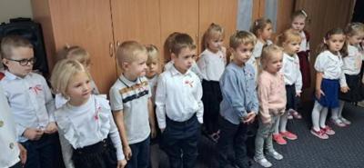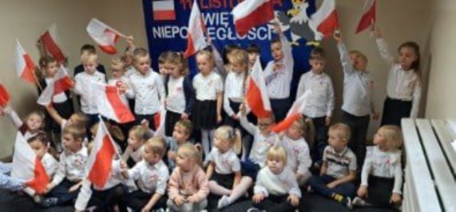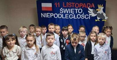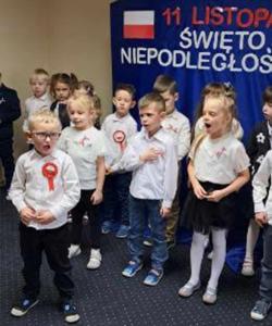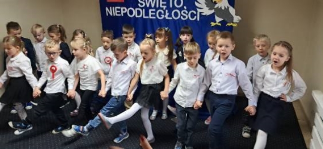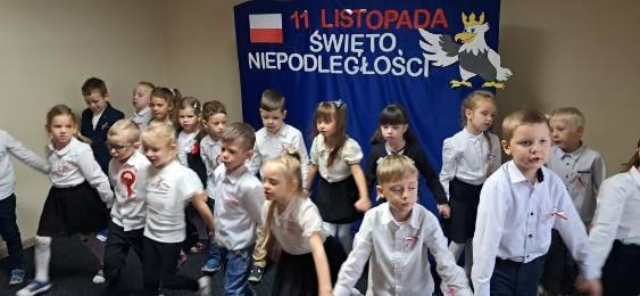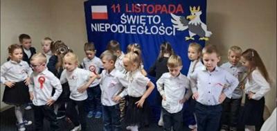 Dnia 8 listopada obchodziliśmy w naszym przedszkolu  Święto Niepodległości. Z tej okazji wszystkie dzieci przyszły ubrane na galowo. Starszaki z grupy Motylki  przedstawiły program artystyczny. Dzieci zaprezentowały wiersze i piosenki ukazujące historię Polski i drogę do odzyskania niepodległości. Zatańczyły również taniec do piosenki „Zasiali górale”. Na koniec uroczystości wszystkie przedszkolaki z dumą, przyjmując właściwą postawę „na baczność”, odśpiewały hymn Polski. Następnie udaliśmy się pod kościół, gdzie  wspólnie z uczniami szkoły podstawowej  odśpiewaliśmy hymn państwowy, włączając się tym samym w ogólnopolską akcję MEN "Szkoła do Hymnu”, która ma na celu pielęgnowanie patriotyzmu i przypomnienie, jak ważne jest to święto dla wszystkich Polaków.