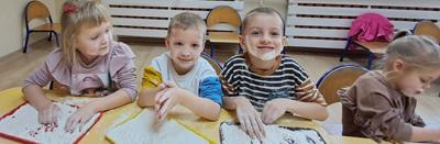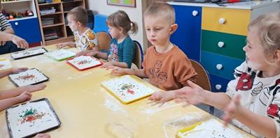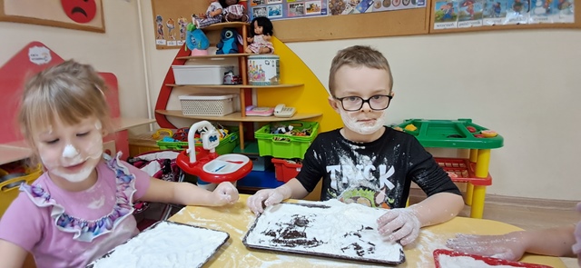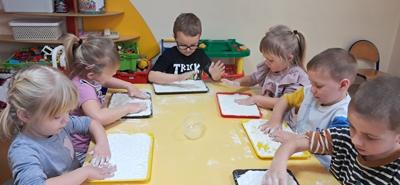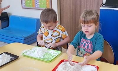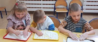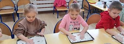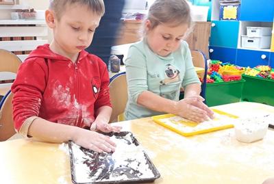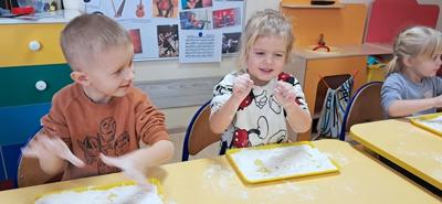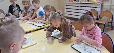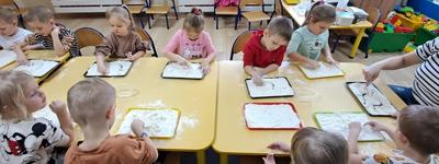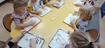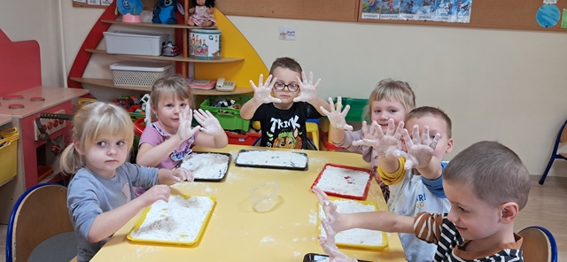 W środę 19 lutego Pszczółki realizowały V zadanie w ramach Ogólnopolskiego Projektu Edukacyjnego – Gramy zmysłami. Tym razem przedszkolaki rozwijały zmysł dotyku w „Brudnym zadaniu”. Dzieci wspaniale bawiły i brudziły się mąką, którą ugniatały, przesypywały, rysowały na niej i wybierały z niej kolorowe kuleczki. Zabaw była przednia co widać na załączonych zdjęciach.
