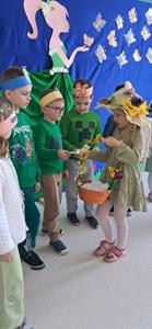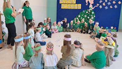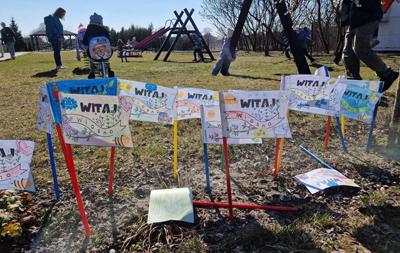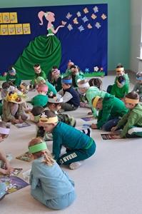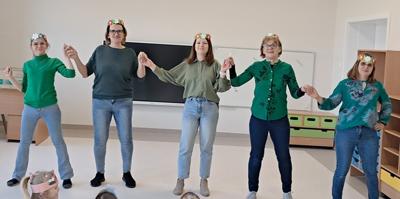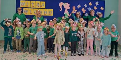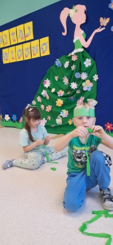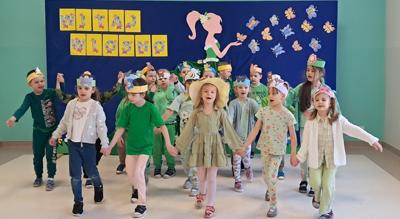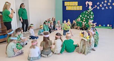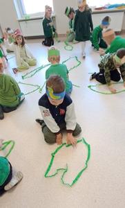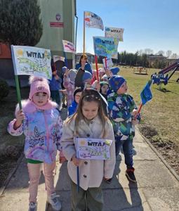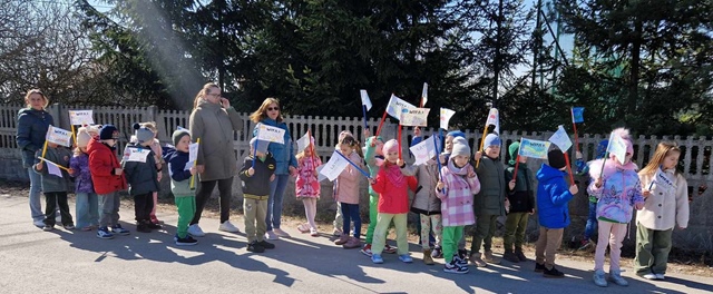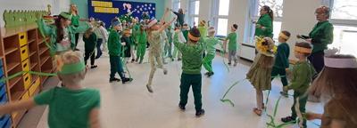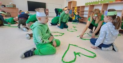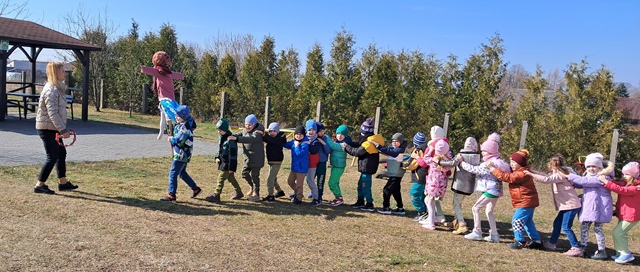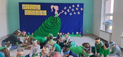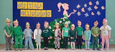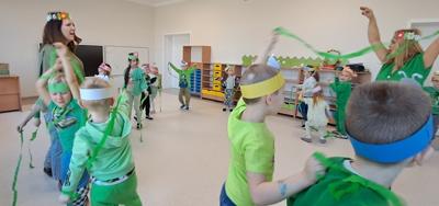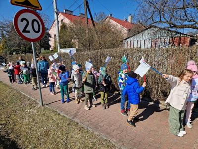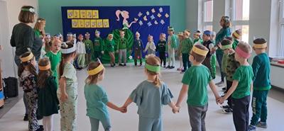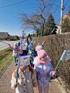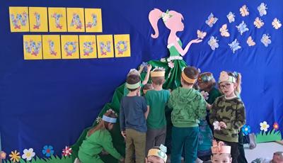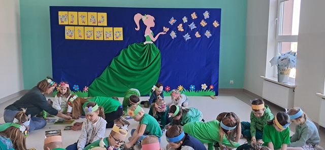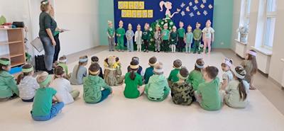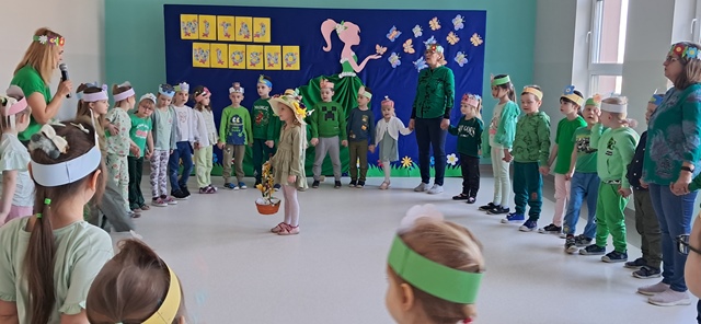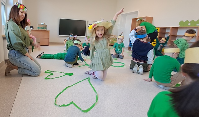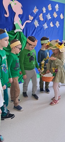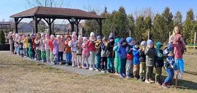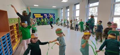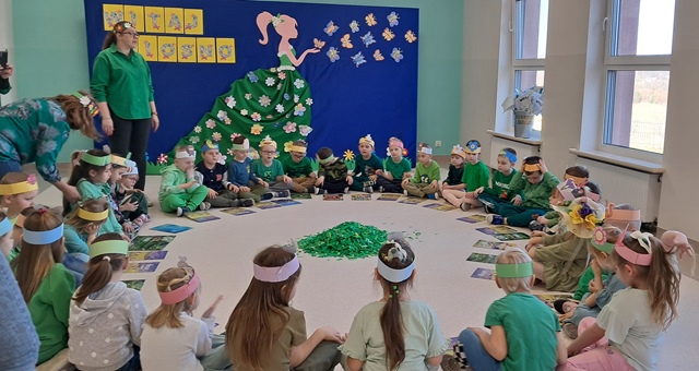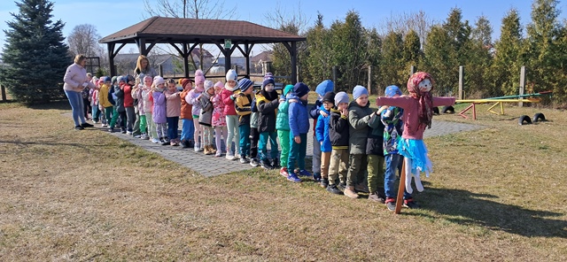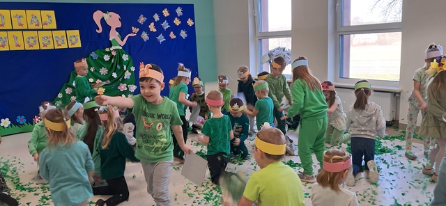 Wreszcie 21 marca przyszła upragniona wiosna. Na tę okazję wszyscy ubrani byli na zielono. Rozpoczęliśmy marszem z Marzanną, a później były wspólne zabawy na sali. Przedszkolaki śpiewały piosenki, recytowały wiersze, tańczyły zwiewnie jak motyle do utworu A. Vivaldiego „Wiosna”. Rozwiązywały wiosenne zagadki, układały listki i serca dla Pani Wiosny z pasków zielonej bibuły. Dookoła wirowały kawałki zielonej bibuły, było magicznie. Na koniec zrobiliśmy wspólne pamiątkowe zdjęcie.