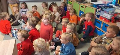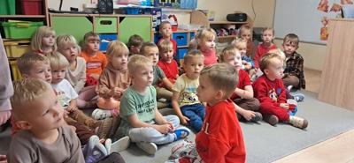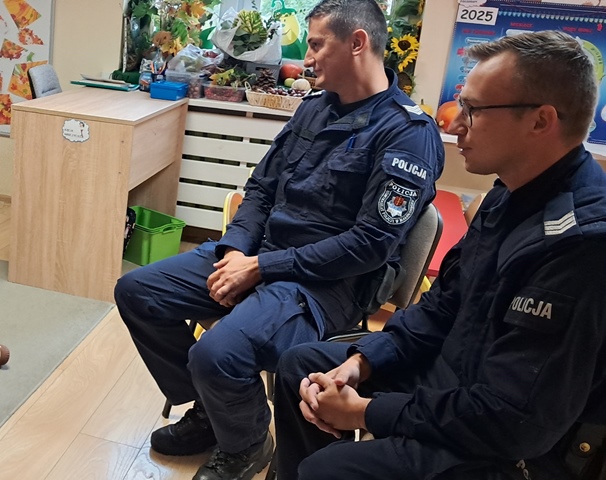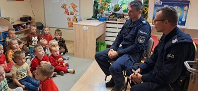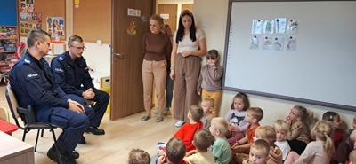 23 września w naszym przedszkolu odbyło się spotkanie z policjantami z Komisariatu Policji w Małogoszczu. Policjanci przypomnieli dzieciom podstawowe zasady ruchu drogowego oraz jak prawidłowo przechodzić przez jezdnię. Mówili o odpowiednim zachowaniu podczas wycieczek oraz o bezpiecznej jeździe rowerem. Na zakończenie spotkania panowie policjanci opowiedzieli o trudnym zawodzie który wykonują.