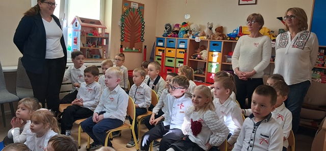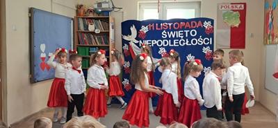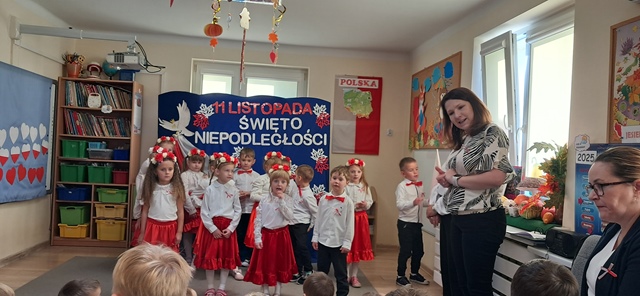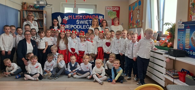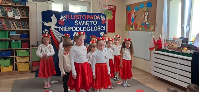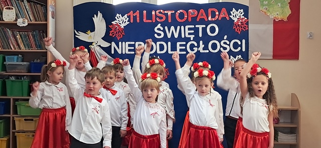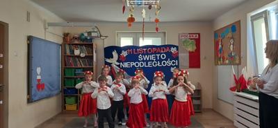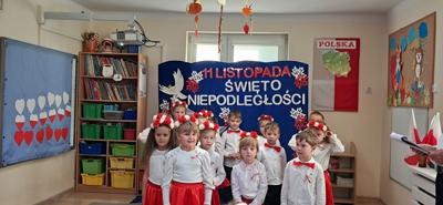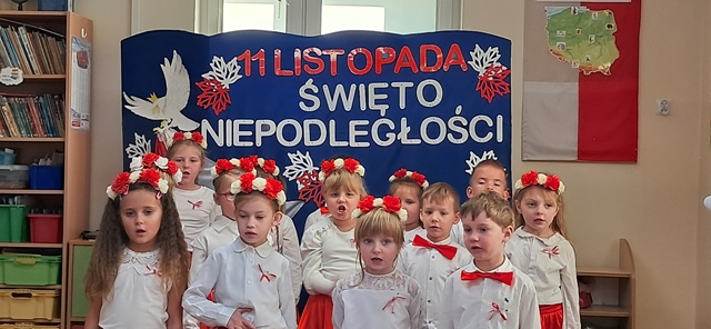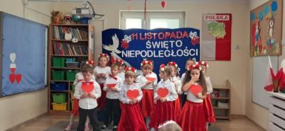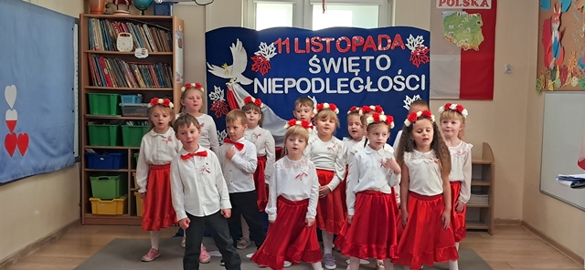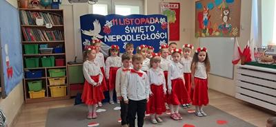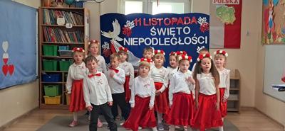 W dniu 06 listopada w naszym przedszkolu odbyła się uroczystość z okazji 107 rocznicy Odzyskania Niepodległości, którą przygotowały dzieci  z grupy Motylki pod kierunkiem p. Agnieszki Orzeł.  Przedszkolaki ubrane w barwy narodowe tańcem, słowem i piosenką oddały szacunek symbolom narodowym i okazały miłość do Ojczyzny. Wszyscy wspólnie odśpiewaliśmy Hymn  Narodowy i zrobiliśmy pamiątkowe zdjęcie.