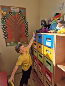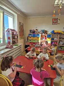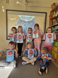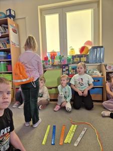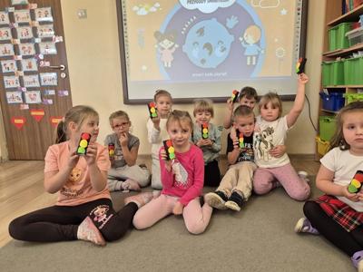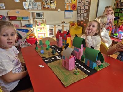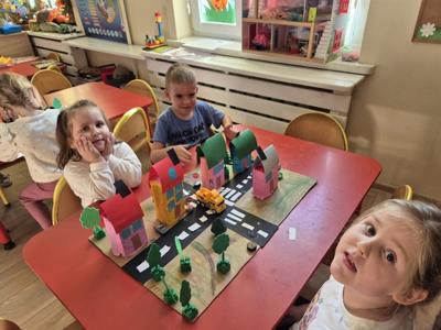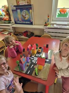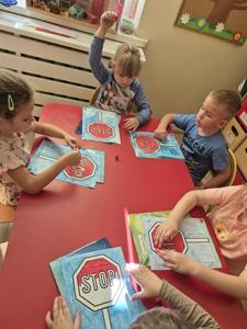 Po części teoretycznej dzieci miały okazję w praktyce wypróbować swoją wiedzę podczas różnego rodzaju zabaw. Wykleiły plasteliną znak STOP, wykonały sygnalizator świetlny i własny odblask w grupach stworzyły makietę miasta.