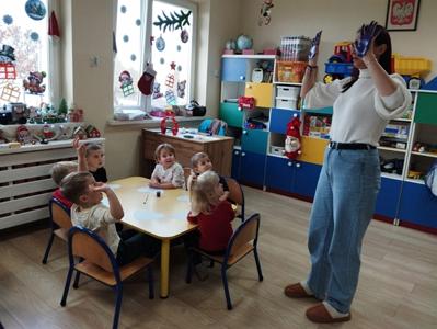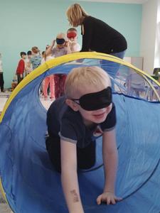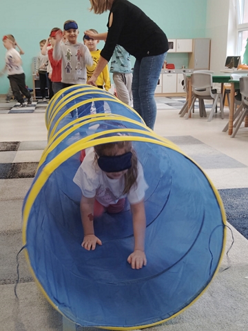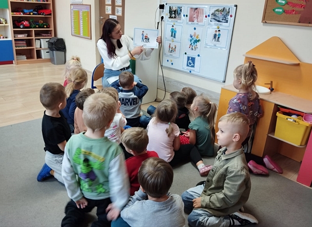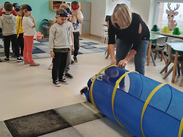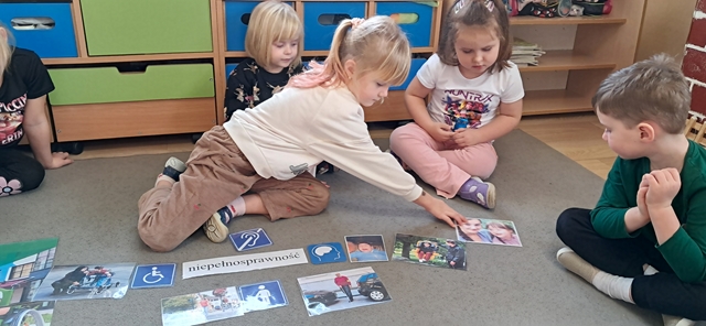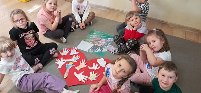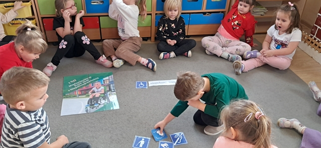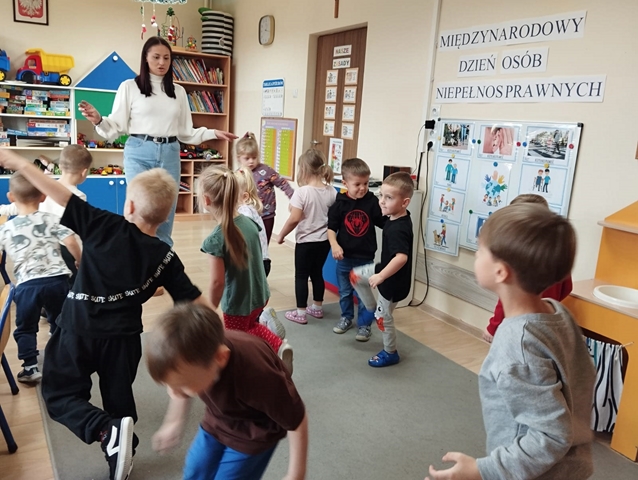 3 grudnia obchodziliśmy Międzynarodowy Dzień Osób z Niepełnosprawnościami. Podczas zajęć przedszkolaki poznały różne rodzaje niepełnosprawności.  Miały też okazję dowiedzieć się z jakimi trudnościami na co dzień borykają się osoby niepełnosprawne i jak ważna jest ich akceptacja i tolerancja. Dowiedziały się, że osoby z niepełnosprawnościami prowadzą ciekawe i aktywne życie. Dzieci pokonywały przeszkody z zasłoniętymi oczami, wykonywały rysunki za pomocą nóg oraz serca dla osób z niepełnosprawnościami.