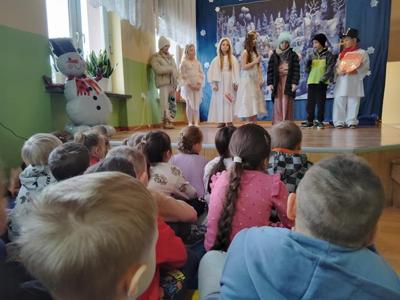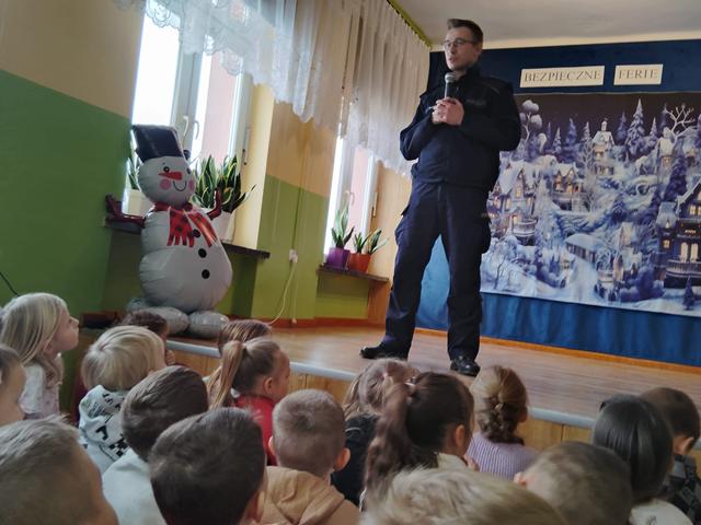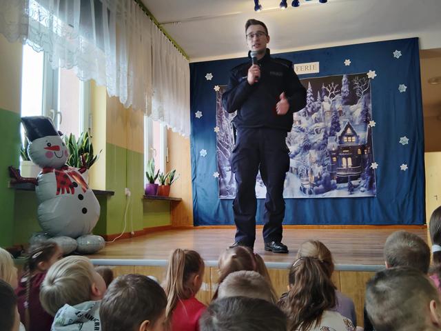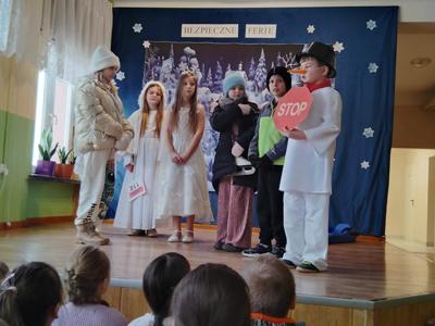W piątek w naszej szkole odbył się apel, podczas którego uczniowie z klas I-III zaprezentowali przedstawienie. W przystępny sposób zostały przedstawione zasady bezpieczeństwa podczas zabaw zimowych. Przedstawienie oglądały przedszkolaki z grupy Biedronki, uczniowie szkoły, nauczyciele, pani dyrektor i policjanci. Po przedstawieniu odbyła się prelekcja na temat bezpieczeństwa podczas zabaw zimowych, którą przeprowadził policjant z Komisariatu Policji w Małogoszczu Pan Szymon Gad. Wszyscy przypomnieli sobie jak odpowiedzialnie korzystać ze ślizgawek, lodowisk i sanek, a także dlaczego nie wolno wchodzić na zamarznięte zbiorniki wodne. Pan policjant mówił również o konieczność noszenia elementów odblaskowych. Na zakończenie Pani Dyrektor życzyła wszystkim udanych i bezpiecznych ferii. Taka sama prelekcja odbyła się w przedszkolu u Pszczółek i Motylków.