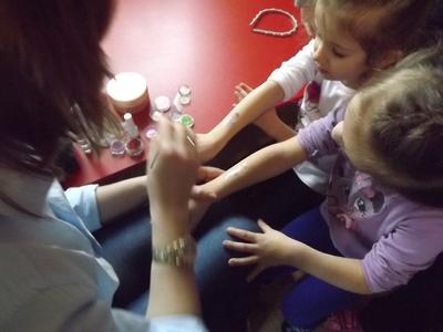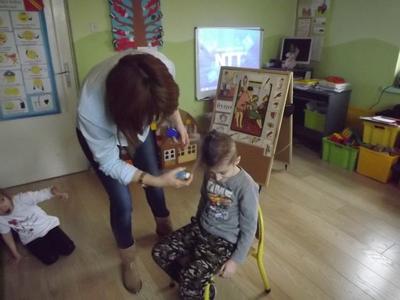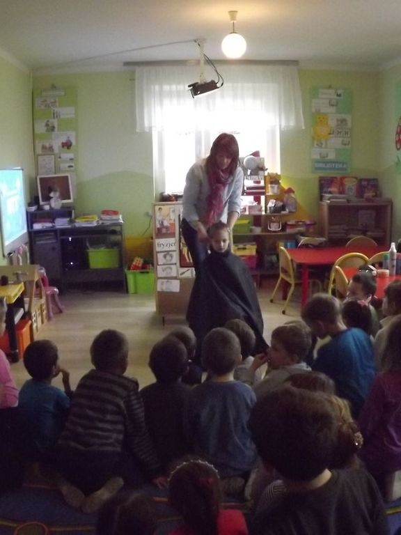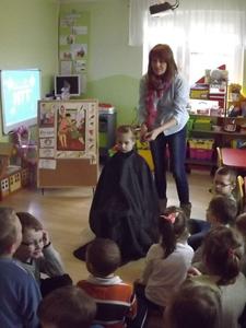 W ramach tematyki "Poznajemy różne zawody" 6 marca gościła w przedszkolu pani Edyta Simlat, która w praktyczny sposób przybliżyła dzieciom zawód fryzjerki. Przyniosła do przedszkola najważniejsze atrybuty fryzjerskie niezbędne do układania, modelowania oraz strzyżenia. Wśród nich były;lokówki,suszarka, nożyczki, kosmetyki potrzebne do tworzenia fryzur. Niespodzianką były fantastyczne fryzury wykonane chłopcom, a dziewczynkom brokatowe tatuaże. Serdecznie dziękujemy pani fryzjerce za przeprowadzenie ciekawych zajęć.